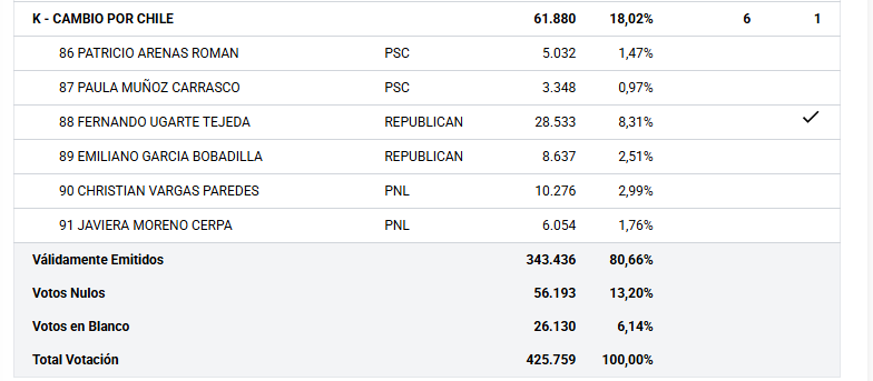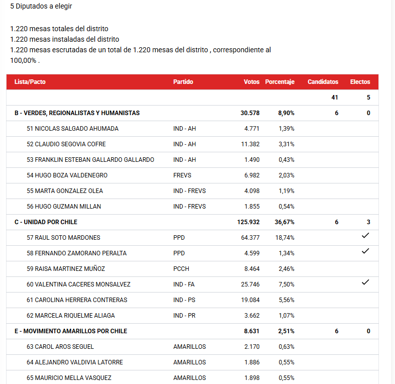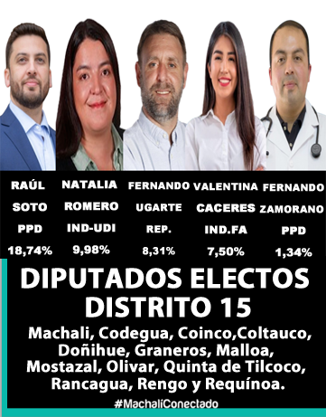 Este domingo 16 de noviembre se eligió a los diputados que representarán al Distrito 15 en el congreso en el periodo 2026-2030, saliendo reelectos Raúl Soto y Natalia Romero y electos por primera vez el Republicano Fernando Ugarte, Valentina Caceres independiente con cupo del Frente Amplio y Fernando Zamorano del PPD que por el sistema de arrastre consiguió un cupo.