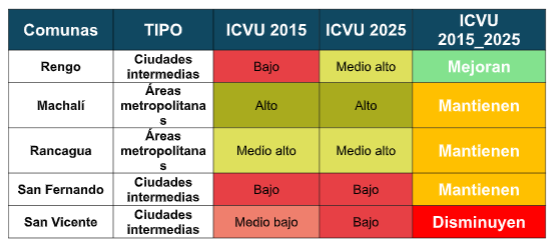 • Rengo: Avanza de nivel bajo 2015 a nivel medio alto 2025, se evidencia una mejora significativa en su calidad de vida urbana. Este progreso se explica por avances en conectividad, vivienda, condiciones laborales, ambiente de negocios y condiciones socioculturales, se mantiene la condición de salud consolidando un desempeño positivo y sostenido en la última década.