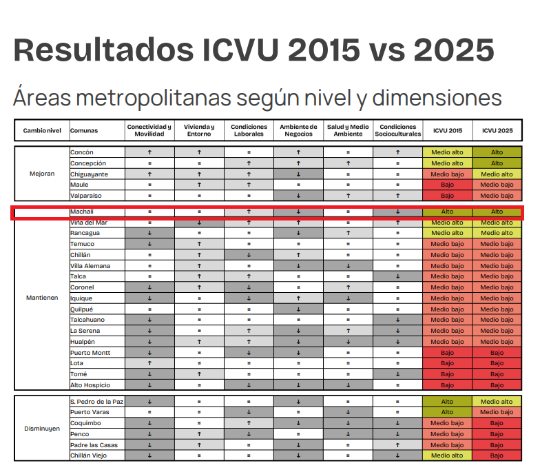 De acuerdo al informe, entre el 2015 y el 2025 la comuna de Machali mantiene su nivel Alto. Asimismo, se mantiene en las variables Conectividad y Movilidad, Vivienda y Entorno y Salud y Ambiente, sube en Condiciones Laborales y baja en Ambiente de Negocios y Condiciones Socioculturales.